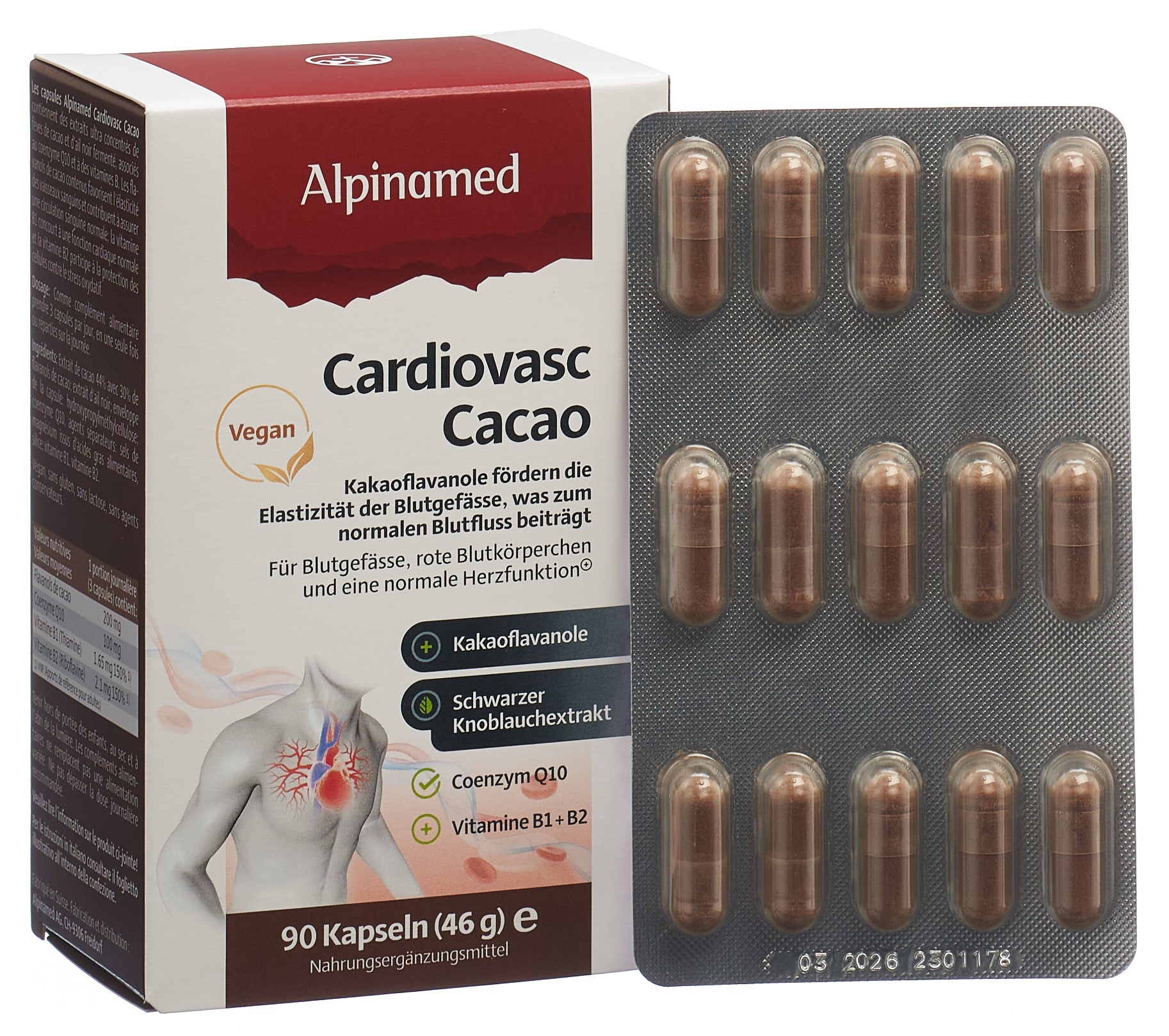 Le capsule contengono un estratto di cacao di alta qualità con un’alta percentuale di flavanoli del cacao, estratto di aglio nero, coenzima Q10 e vitamine del gruppo B (B1 e B2). Il sangue è responsabile del trasporto dell’ossigeno che consente agli organi di funzionare in modo ottimale. Tuttavia, i vasi sanguigni possono perdere la loro elasticità, compromettendo il flusso sanguigno. I flavanoli del cacao contenuti in Cardiovasc Cacao capsule di Alpinamed aiutano a mantenere l’elasticità dei vasi sanguigni, la quale contribuisce a un normale flusso sanguigno. Le vitamine del gruppo B contenute sostengono il mantenimento della funzione cardiaca e delle cellule del sangue e proteggono le cellule dallo stress ossidativo.