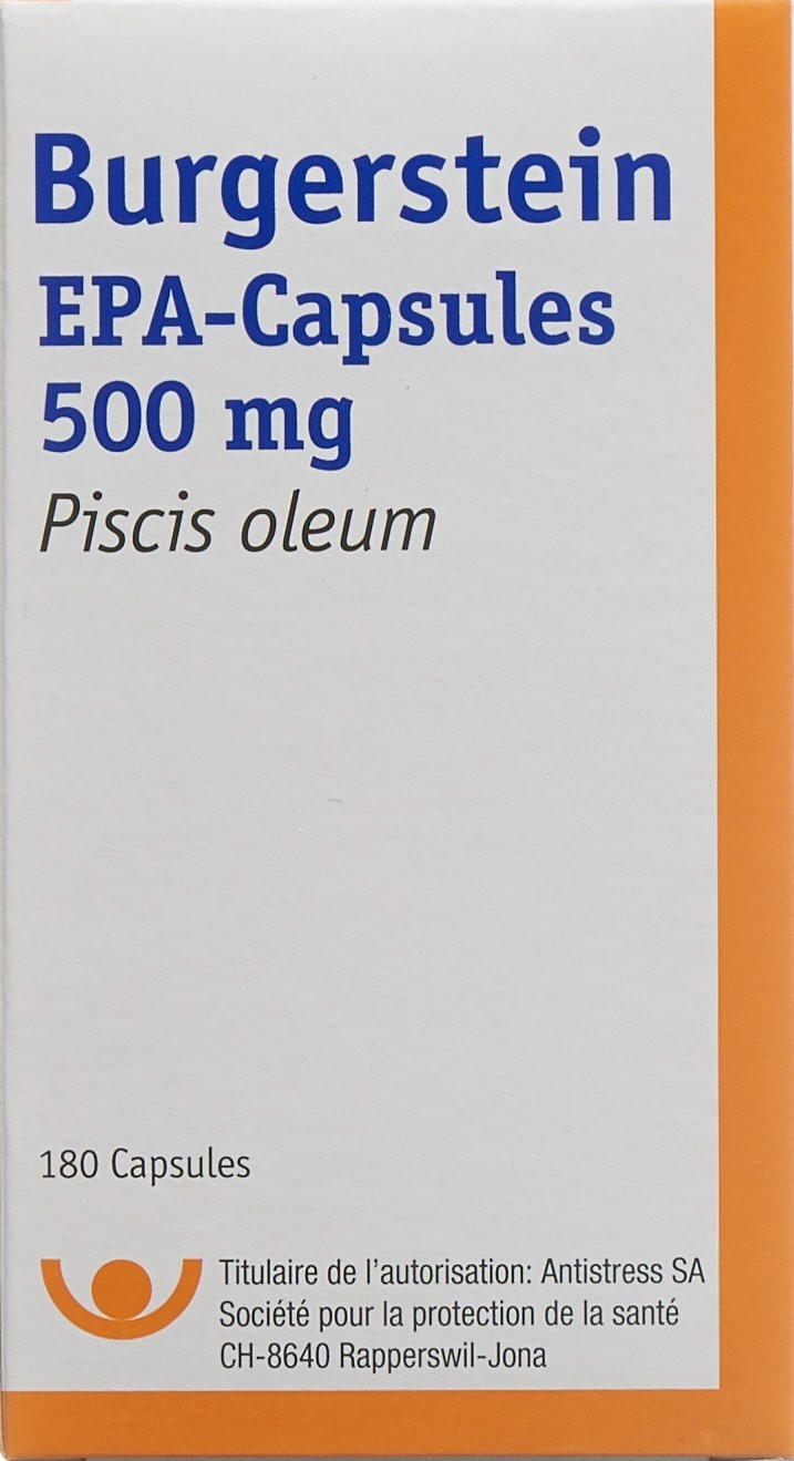 Burgerstein EPA-Kapseln 500 mg contiene un concentrato a base di olio di pesce con diversi acidi grassi polinsaturi, acidi grassi essenziali (acidi grassi omega-3) che in gran parte non sono presenti nella nostra alimentazione. Il corpo ha bisogno di questi acidi grassi per la formazione di sostanze ormonali (prostaglandine, trombossani, leucotrieni). Una carenza di acidi grassi omega-3 può contribuire all’insorgenza di alcuni disturbi del metabolismo.
