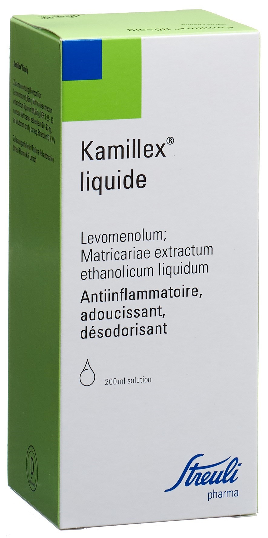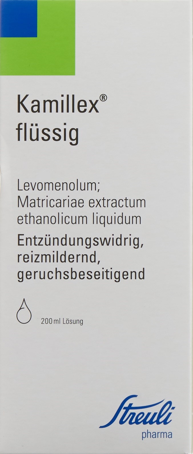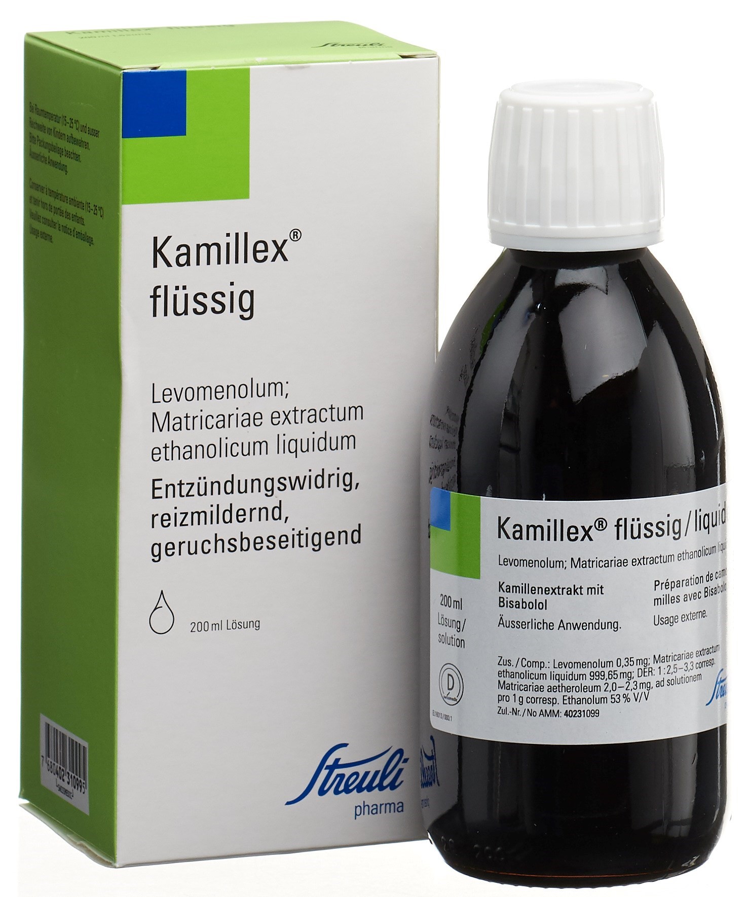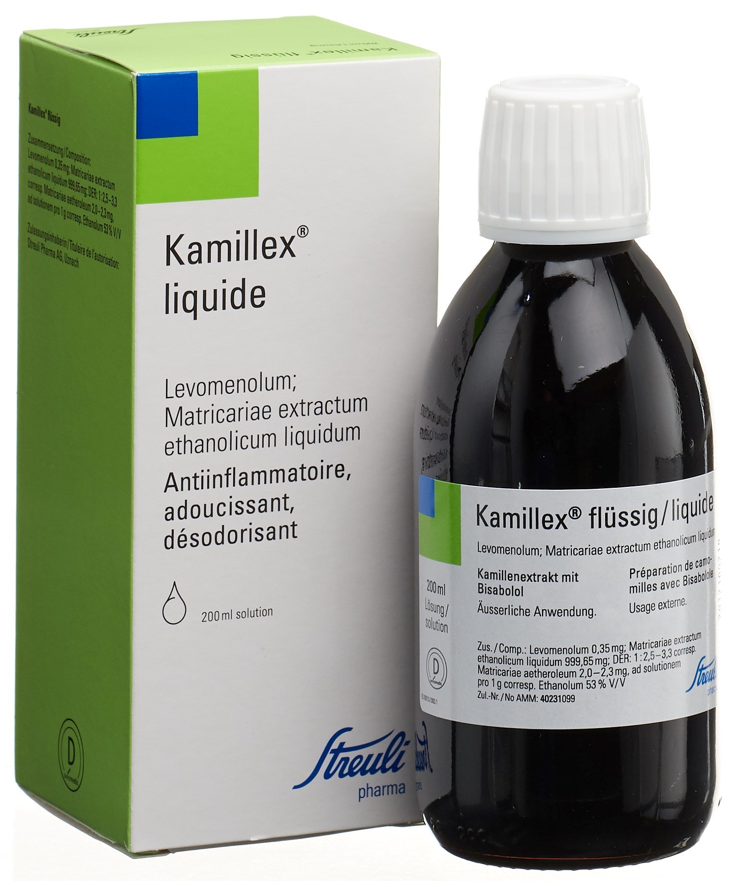 Kamillex, liquido è un estratto alcolico standardizzato di fiori di camomilla con l’aggiunta di bisabololo, un componente della camomilla. Kamillex, liquido è un medicamento antinfiammatorio, analgesico, antipruriginoso e leggermente disinfettante con proprietà lenitive e deodoranti.