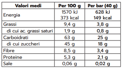 Ingredienti gusto “Arancia”: uvette (uvette, olio di semi di girasole), sciroppo di amido di frumento, mele, albicocche (albicocche, conservante: anidride solforosa, farina di riso), cubetti all’arancia 10% (purea di mela 45%, sciroppo di fruttosio-glucosio, sciroppo di glucosio, concentrato di arancia 7%, zucchero, umidificante: glicerolo, fibra di frumento, correttore di acidità: acido citrico, gelificante: pectina, grasso di palma, aroma naturale, antiossidante: acido ascorbico), fiocchi d’avena, semi di girasole, estruso di mais, wafer (amido di patata, acqua, olio di oliva), grasso di palma, emulsionante: lecitina di soia, aroma.