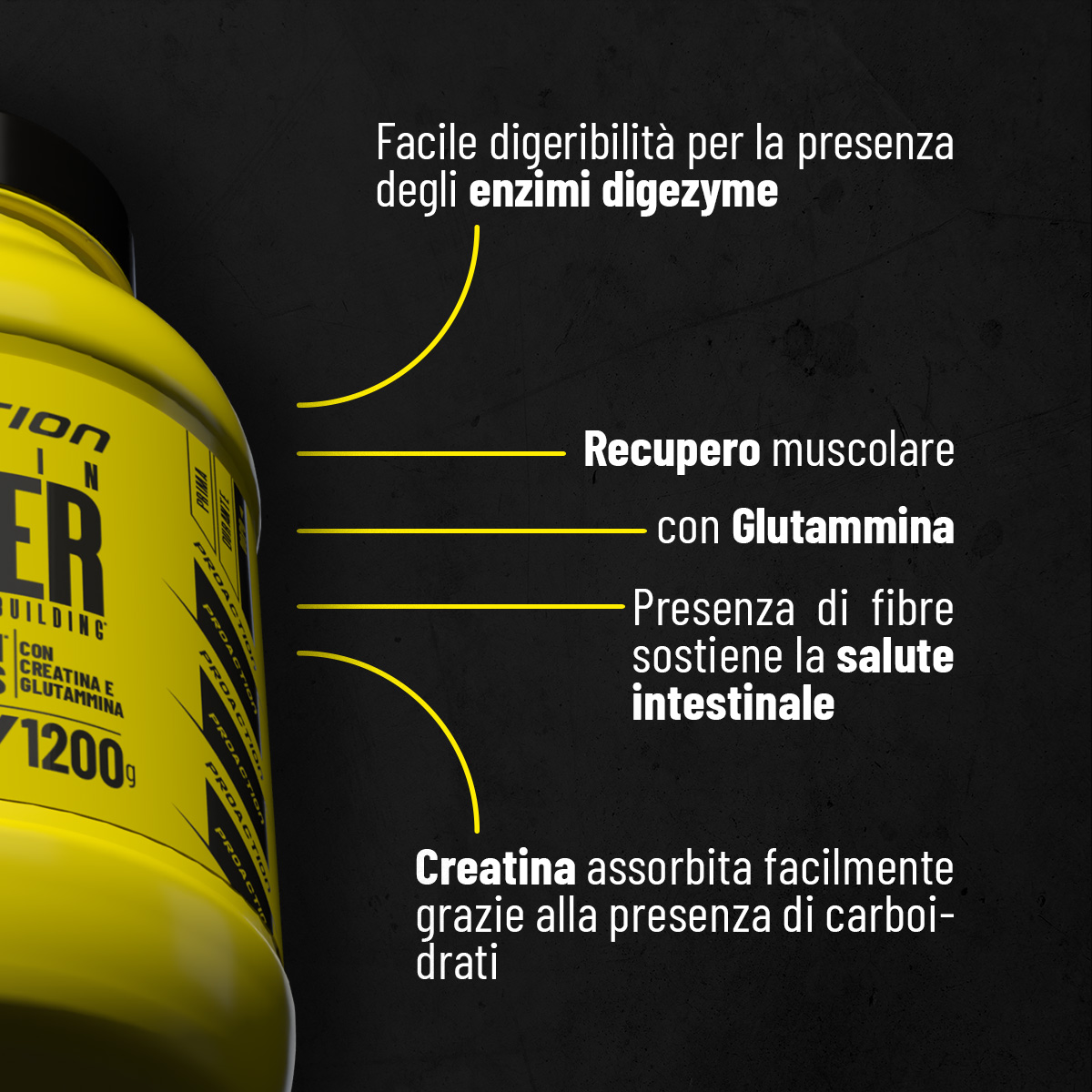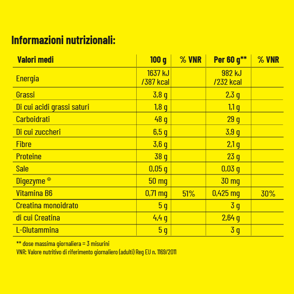 Ingredienti: Farina di riso; maltodestrine; farina di avena (senza glutine); proteine concentrate del siero del latte; caseinato di calcio (contiene latte); latte in polvere; cacao in polvere 6%; L- glutammina; creatina monoidrato; aroma; agente antiagglomerante: biossido di silicio; edulcorante: sucralosio; complesso enzimatico Digezyme® (alfa amilasi 24000 DU/g, proteasi 6000 PC/g, cellulasi 1100 CU/g, lattasi 4000 ALU/g, lipasi 200 FIP/g); piridossina cloridrato (vitamina B6).
