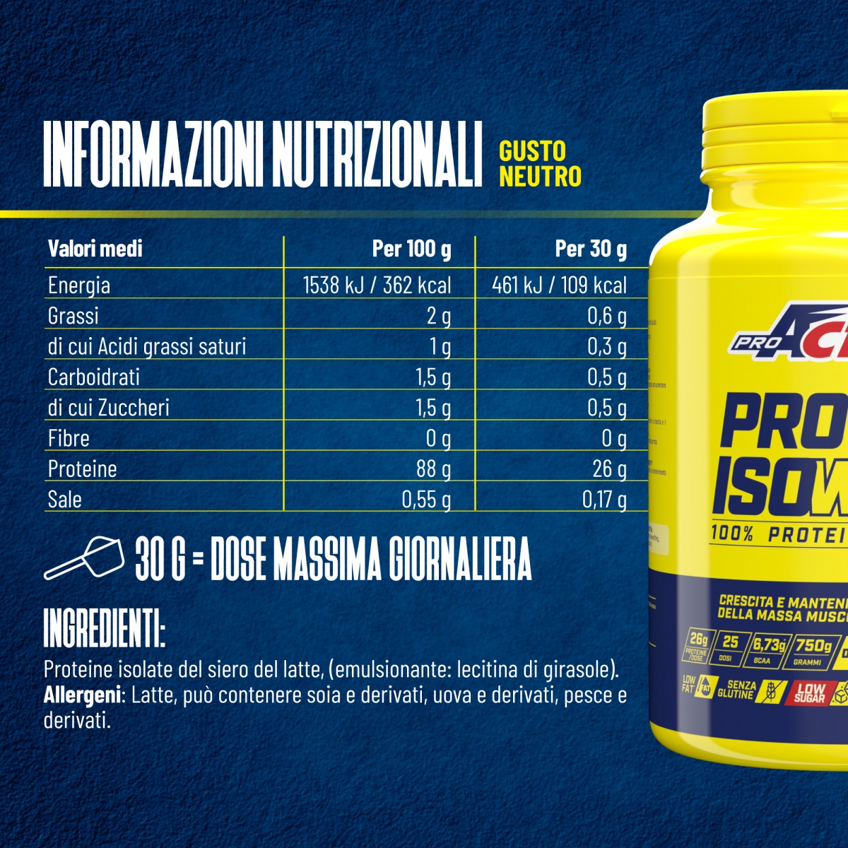 Ingredienti: Proteine isolate del siero del latte, emulsionante: lecitina di girasole.