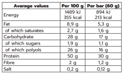 Ingredienti: proteine del latte, collagene idrolizzato, edulcorante: sciroppo di sorbitolo, proteine isolate di soia, olio di semi di girasole, copertura al gusto di cioccolato fondente 12% (grassi vegetali -da cocco e palmisti-, saccarosio, cacao magro in polvere 15%, emulsionante: lecitina di soia, aromi), cacao in polvere 1%, emulsionante: lecitina di soia, aromi, conservante: sorbato di potassio.